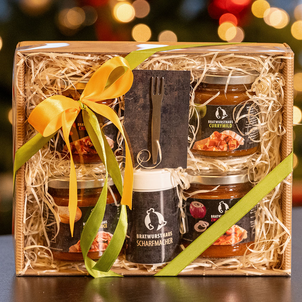 Unsere kleine Geschenkbox "Glückauf" beinhaltet die leckeren Bochumer Bratwursthaussaucen:
