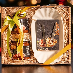 Das ideale Geschenk für Paare. Zwei Porzellanschalen, zwei Edelstahlpieker, ein 200 ml Glas Currysauce und ein 200 ml Glas Curry MILD.